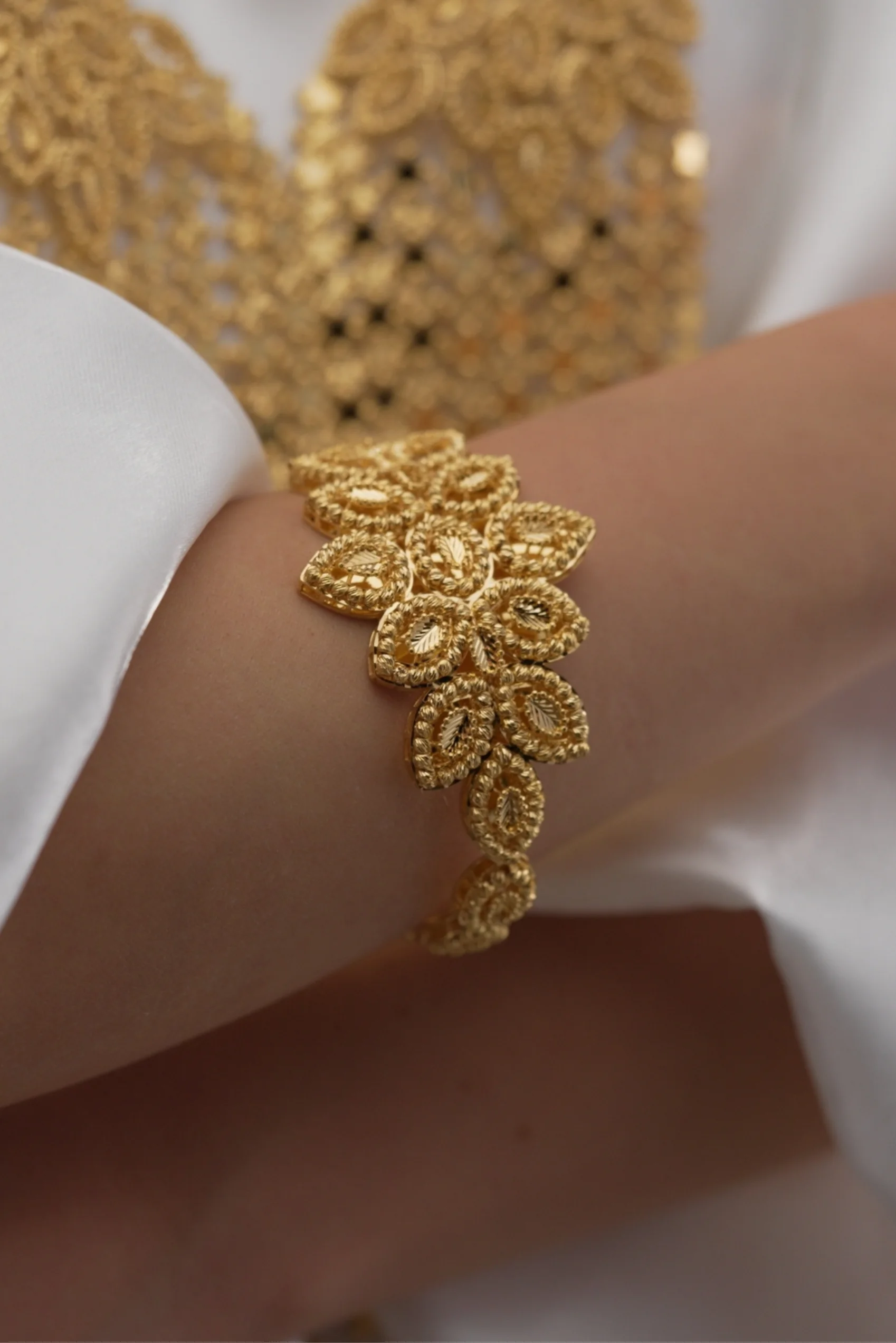 يُجسد سوار أوراق الشجر الفخامة العربية والحرفية الدقيقة، حيث يُعد أحد أبرز إبداعات مجوهرات إسلامية فاخرة. يتميز التصميم بتفاصيل أوراق الشجر المنحوتة بدقة على قاعدة من الذهب عيار 21 قيراطًا. علاوة على ذلك، يُضفي الشكل النباتي مظهرًا طبيعيًا ومفعمًا بالحيوية، بينما يعكس روح الهوية الإسلامية من خلال الزخارف الفنية المستوحاة من الطبيعة.